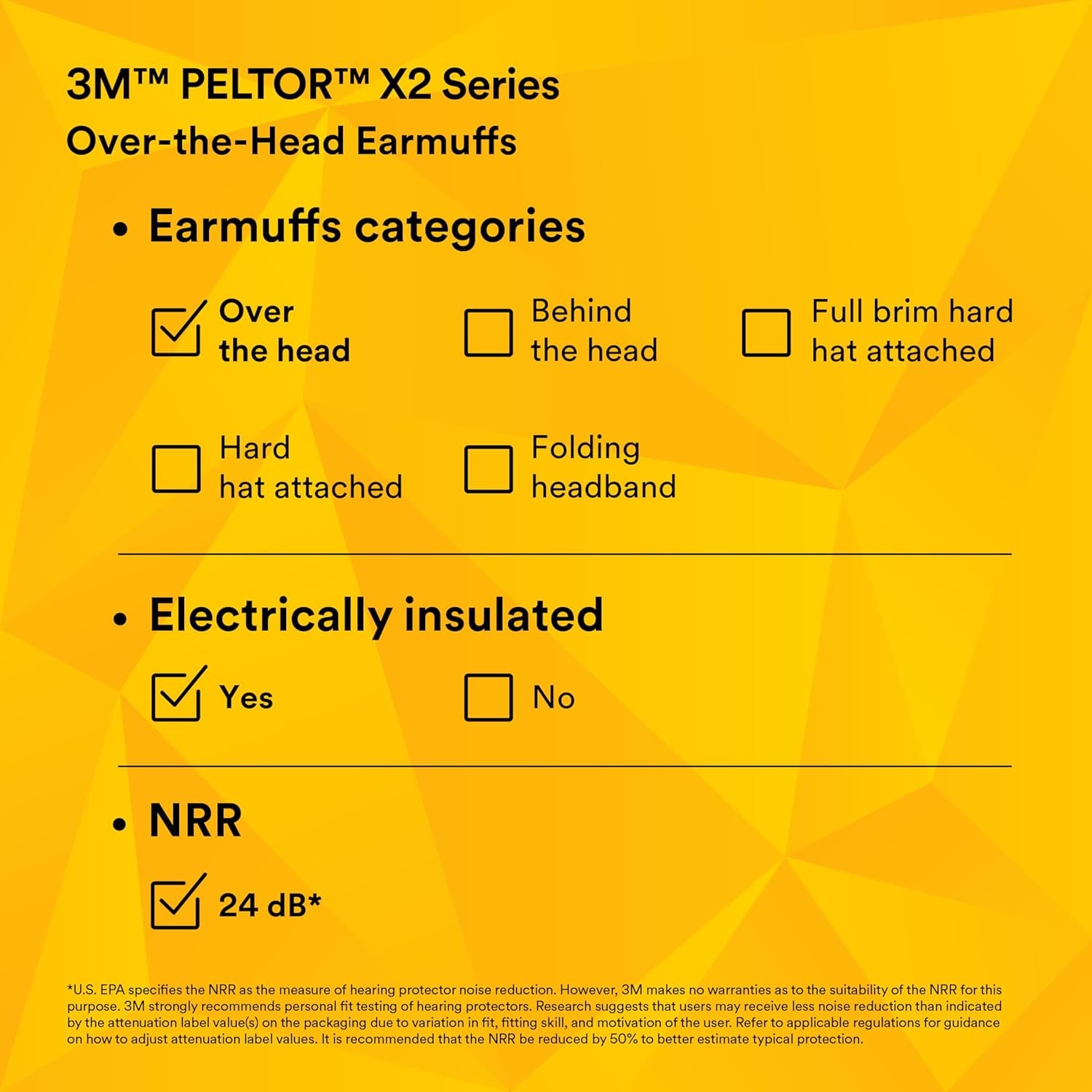 The X-Series earmuffs are 3M’s latest advancement in hearing conservation. New technologies in comfort, design and protection all come together in this groundbreaking earmuff line. The X2A is a lightweight, lower-profile earmuff designed for protection against low-to-moderate level industrial noise and other loud sounds. It features an electrically insulated wire headband, often referred to as “dielectric”. – The wire headband offers consistent pressure over prolonged wearing periods – Earcup pivot points tilt for optimum comfort and efficiency – Replaceable ear cushions and foam liners (hygiene kit HYX2) – Noise Reduction Rating (NRR)b 24 dB. CSA Class A NOTE: The X-Series (over-the-head) headband version is electrically insulated -sometimes referred to as ”dielectric”. The metal components of the headband have been covered by non-conductive material for use in a low voltage electrical hazard (less than 440 V ac). As there are no applicable standards for testing ear muffs against electrical insulating properties, the product has been evaluated at an external laboratory against a modified test method based on EN397:1995. During assessment, the leakage current did not exceed 1.2mA when the external surface of the product made contact with an electrical source. The user must determine the overall suitability of this product for the intended application taking into account any hazards other than noise for which this product is tested. *The NRR may overestimate the hearing protection provided during typical use. 3M recommends reducing the NRR by 50% for estimating the amount of noise reduction provided. Hearing Protection Solutions Made Innovatively Easy.