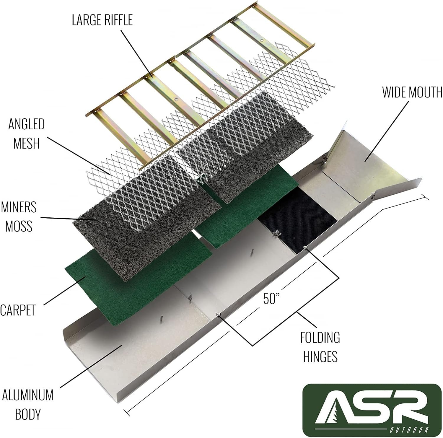 50 Inch Folding Sluice Box: Folding down to just 15 inches, this compact aluminum sluice box comes pre-assembled with built in miners moss, carpet and 18 gauge steel zinc-plated riffles, making it a high yield gold recovery gold mining tool