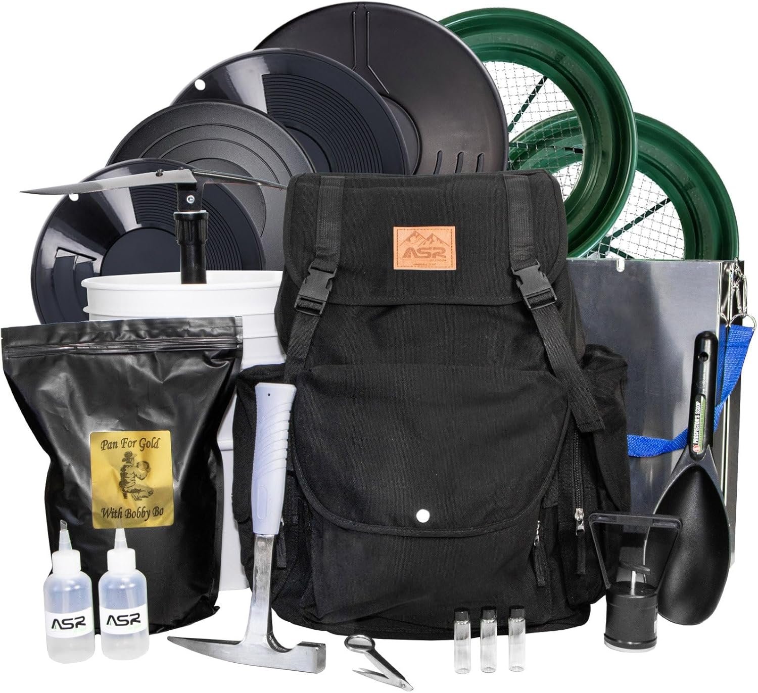 GOLD PANNING KIT: A portable kit for the avid prospector, we've included all the necessary gold prospecting equipment for end to end processing, as well as a 10lb bag of ASR Outdoor x Bobby Bo intermediate paydirt for continued off site gold panning skill and technique development