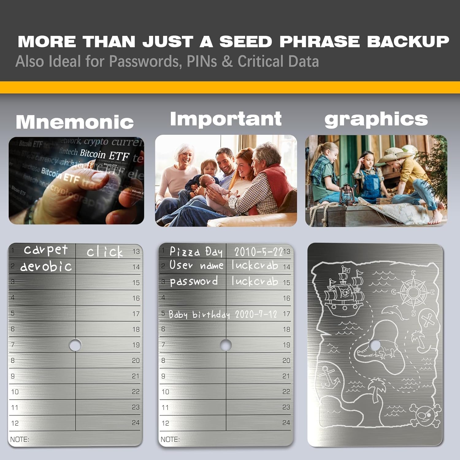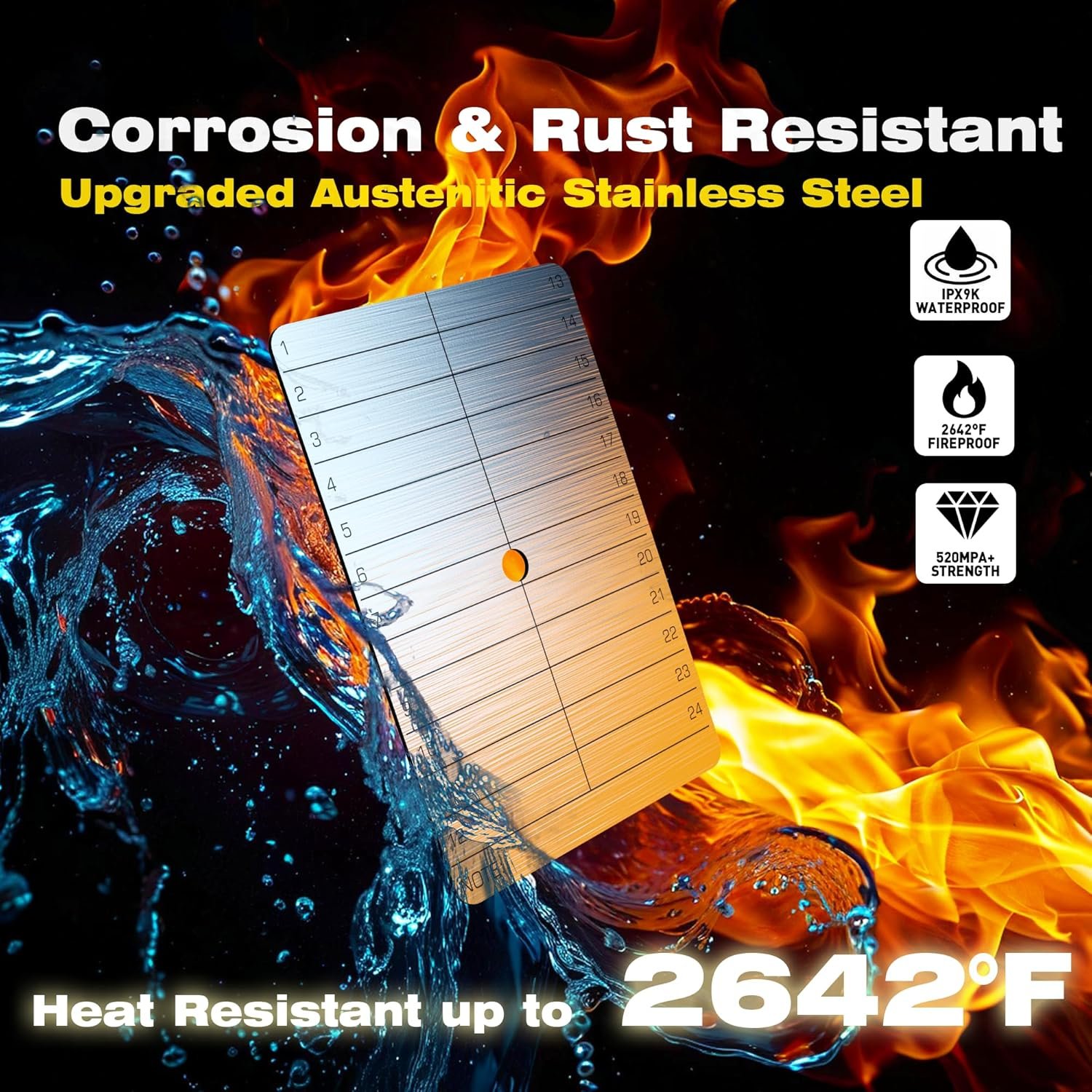 【INDESTRUCTIBLE SEED VAULT】 Safeguard your legacy with our fireproof seed phrase plate. Crafted from hardened austenitic stainless steel, this metal seed phrase plate offers ultimate protection against fire, water, and corrosion. This robust stainless steel seed storage solution ensures your assets survive any disaster, offering far more durability than a seed storage book or binder