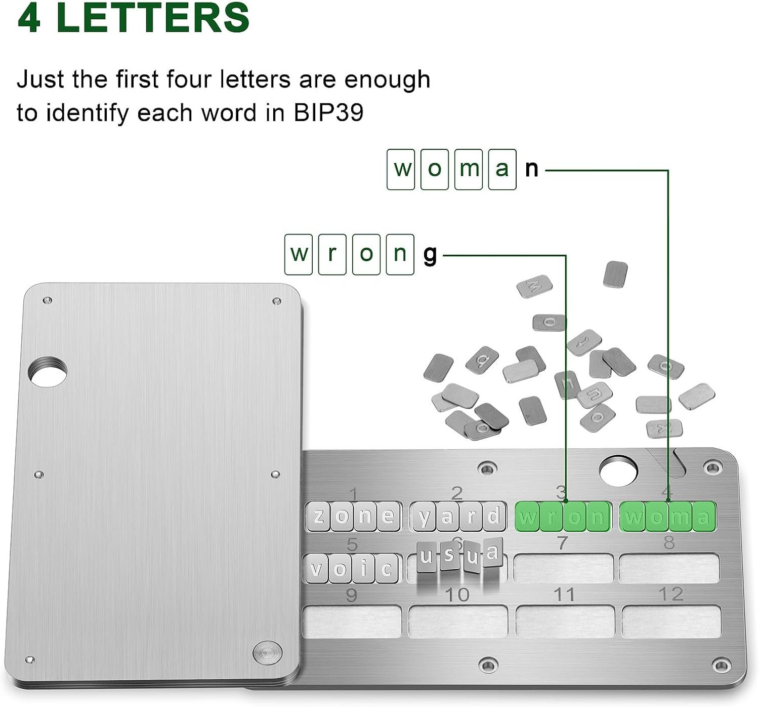 This metal mnemonic wallet allows 24-word crypto seed phrases and stores the first 4 letters of each word. As per the BIP39 standard, the first 4 letters of each word in the mnemonic list are different, four letters can be used to represent a unique mnemonic