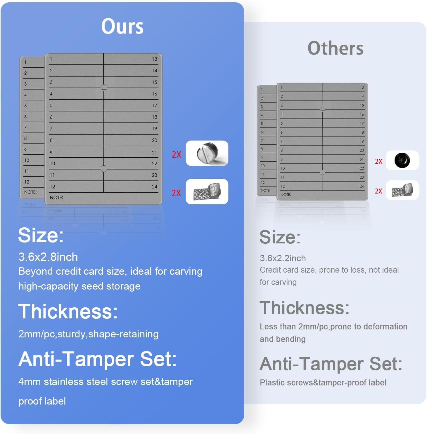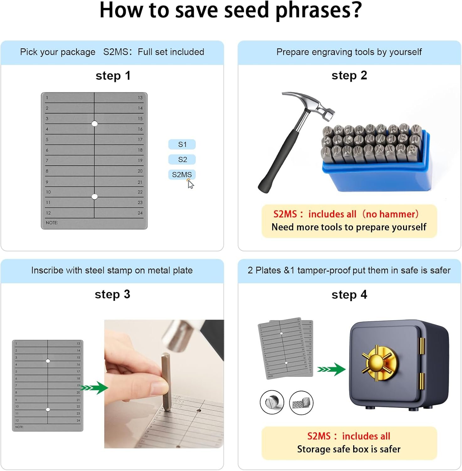 The tamper-proof tool ensures unauthorized access prevention,keeping your seed phrases secure.This robust metal plate is rust-proof,water-proof,fire-proof and designed to withstand extreme environments,ensuring top-level security.