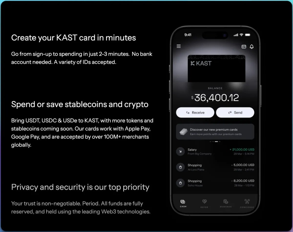 Unlike earlier crypto cards that felt like clunky add-ons to exchanges, KAST built its entire ecosystem around seamless spending. The platform combines multiple elements: