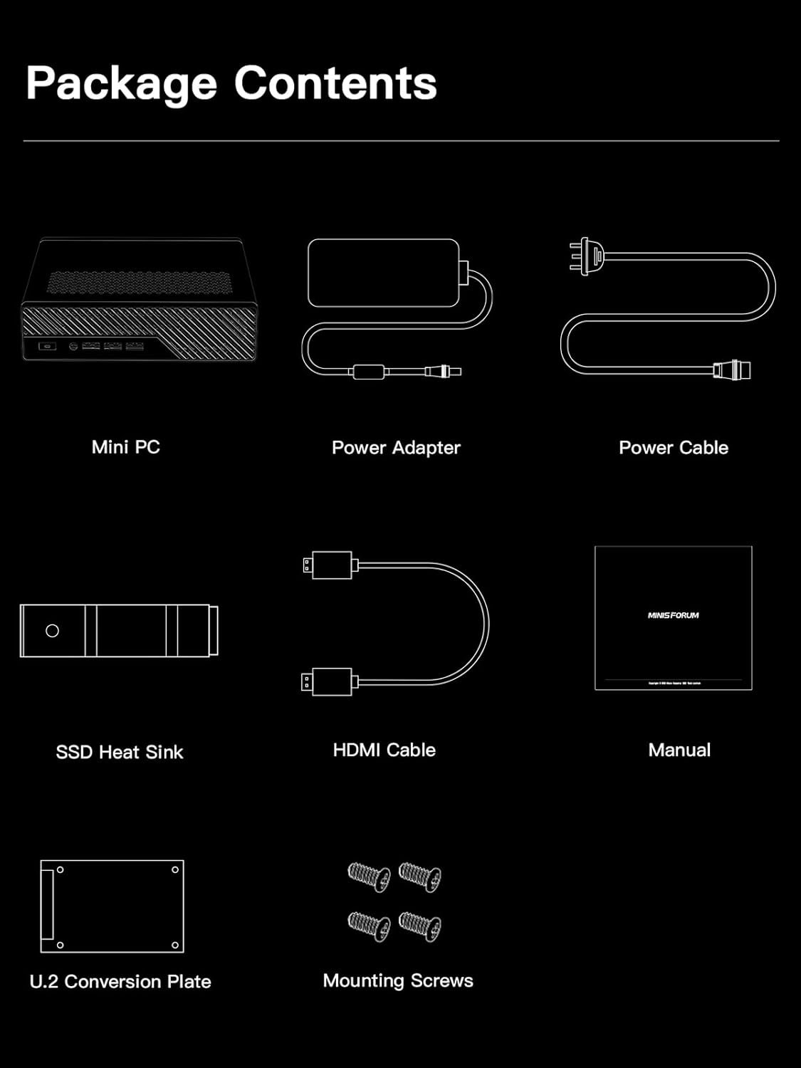 【Package contents】 1xMS-01 MiniWorkStation, 1x U.2- M.2 Conversion Adapter, 1x Power Adapter, 1x Power Cord, 1x SSD Heat Sink, 1x HDMI Cable, 1x Screw Set, 1x Manual.