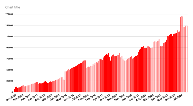 As you can see in the above chart, nearly all the growth in Kitely Market has been in content that can be exported to other grids — that is the green area on the graph. The red area, of non-exportable content, has stayed level for the past eight years.