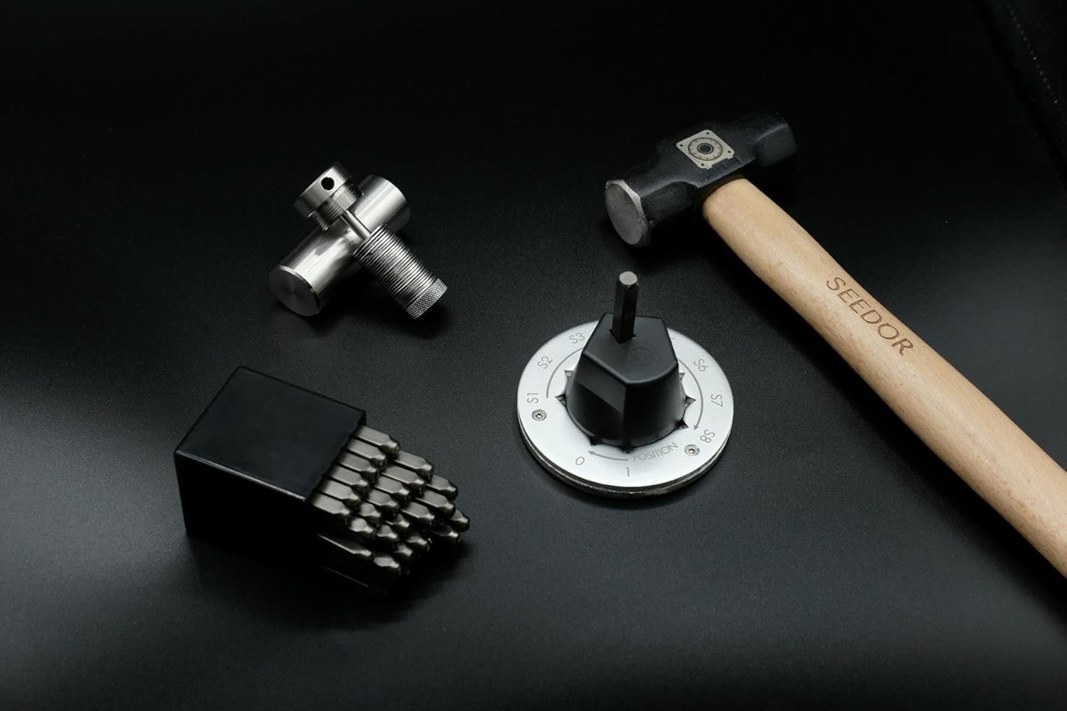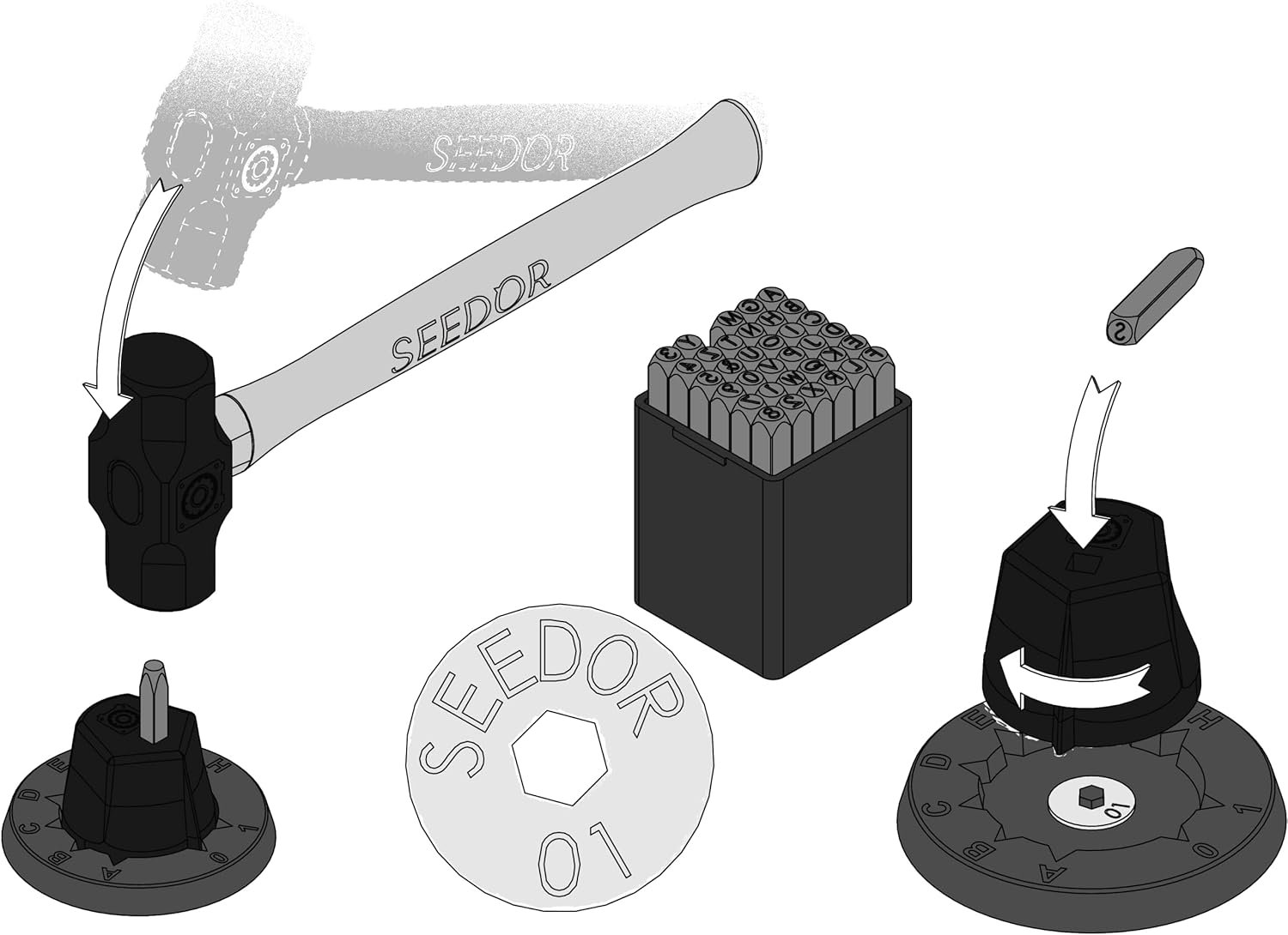SCOPE OF DELIVERY: 1x Seedor Safe, 28x disks to hold your seed, 4x tamper-proof labels, 1x alphanumeric punch set, 1x holder, 1x base plate made, 1lb Hammer with hickory handle, 1x gift box.
