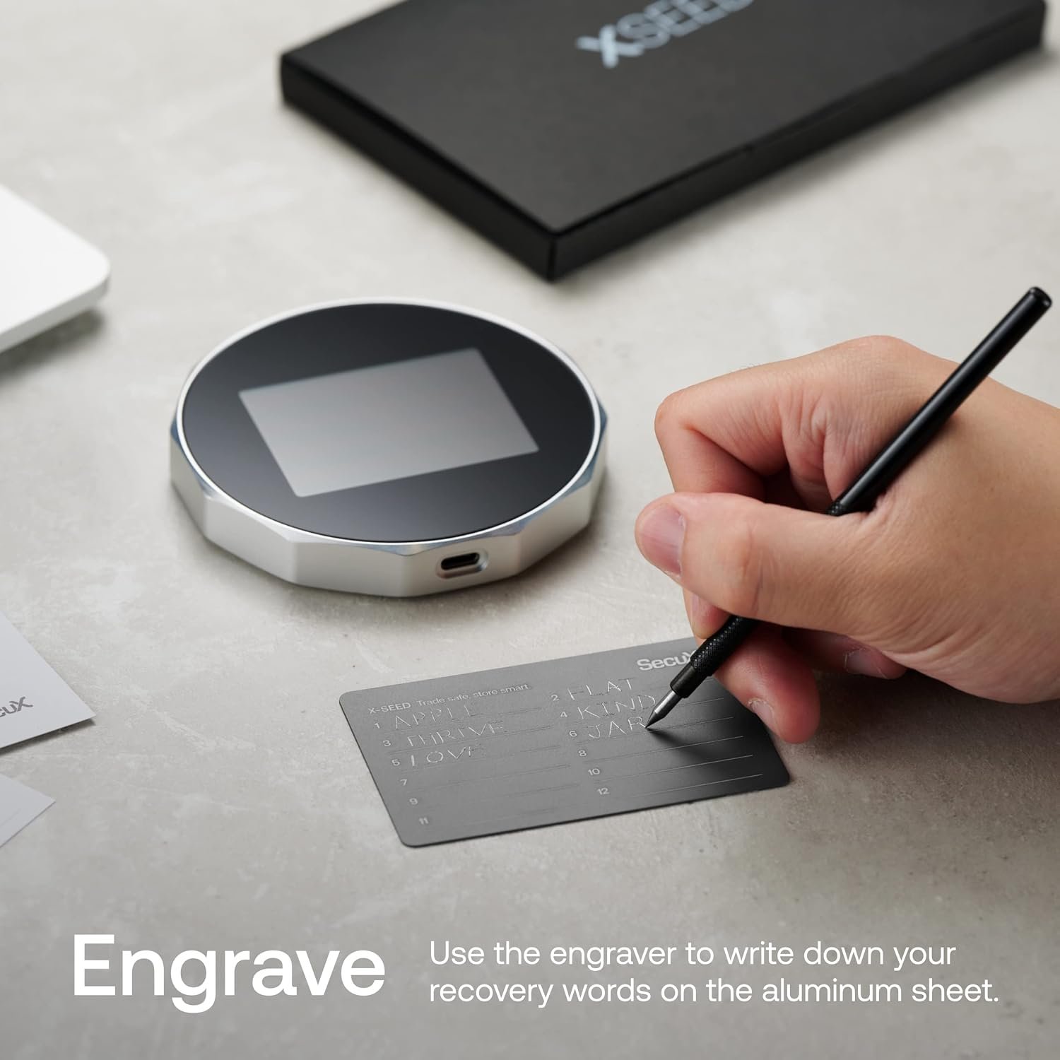 Use the engraver to write down your recovery words in the correct order on the aluminum sheet.