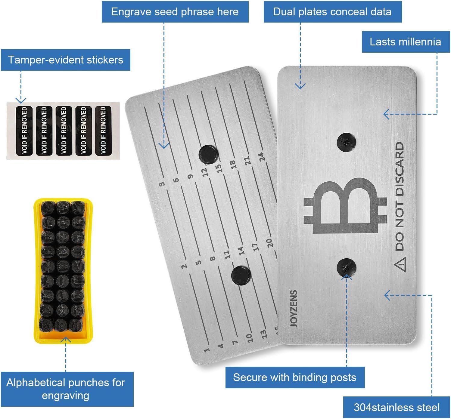 Easy-to-Use Stamping Kit Comes with alphabet & number stamps for perfect impressions No messy engraving—permanent, error-free seed phrase backup